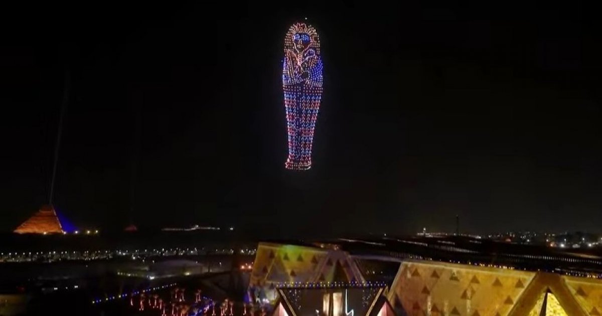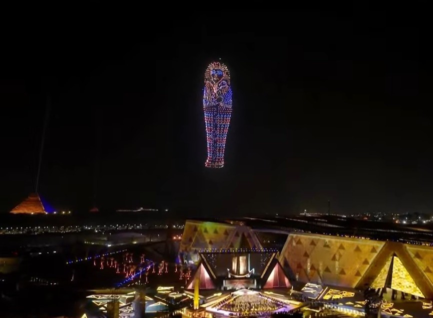 وشهد حفل الافتتاح أجواء احتفالية مبهرة حيث أضاء المتحف أنواره أمام الضيوف، لتظهر القطع الأثرية الفرعونية النادرة، بينما انعكست الأضواء على سماء الأهرامات لتشكل مشهدا مهيبا. وتخللت اللحظات التاريخية ألعاب نارية، وأنغام الترانيم المصرية القديمة، ومجسمات ضوئية زينت الصرح الثقافي العملاق.